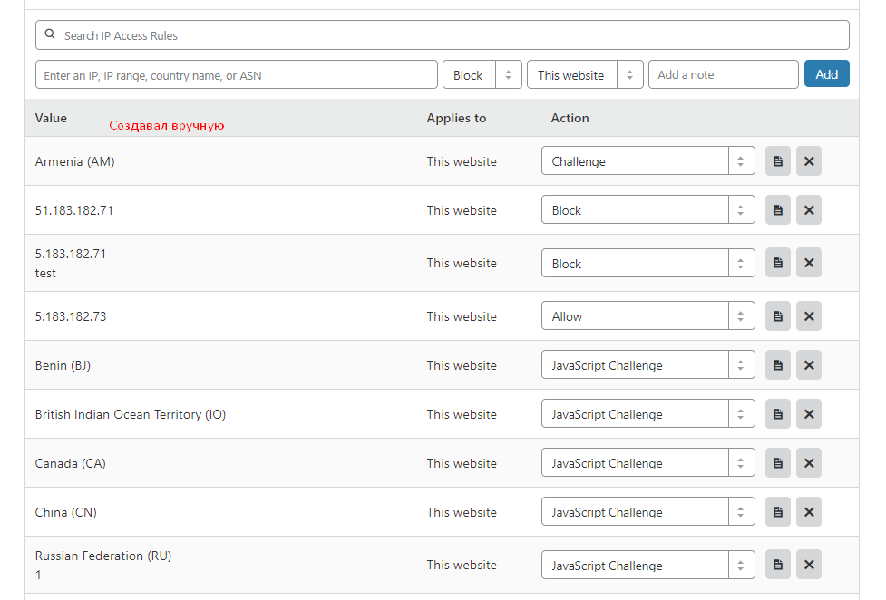 Если настройки по умолчанию, то в Cloudflare заносятся целиком страны, если они не в белом списке. То есть не отдельные IP из Филлипин, а целиком на страну срабатывает капча. Отдельные IP блокируются только для стран из белого списка (см. настройки).